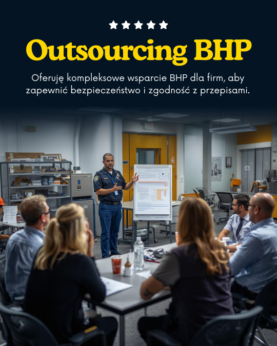 Nie masz w firmie własnej służby BHP? Skorzystaj z profesjonalnego outsourcingu BHP, który zapewni Twojej firmie pełną zgodność z przepisami prawa pracy oraz realne bezpieczeństwo pracowników. Oferuję kompleksową obsługę BHP firm – od dokumentacji, przez szkolenia, aż po stałe doradztwo i wsparcie podczas kontroli.